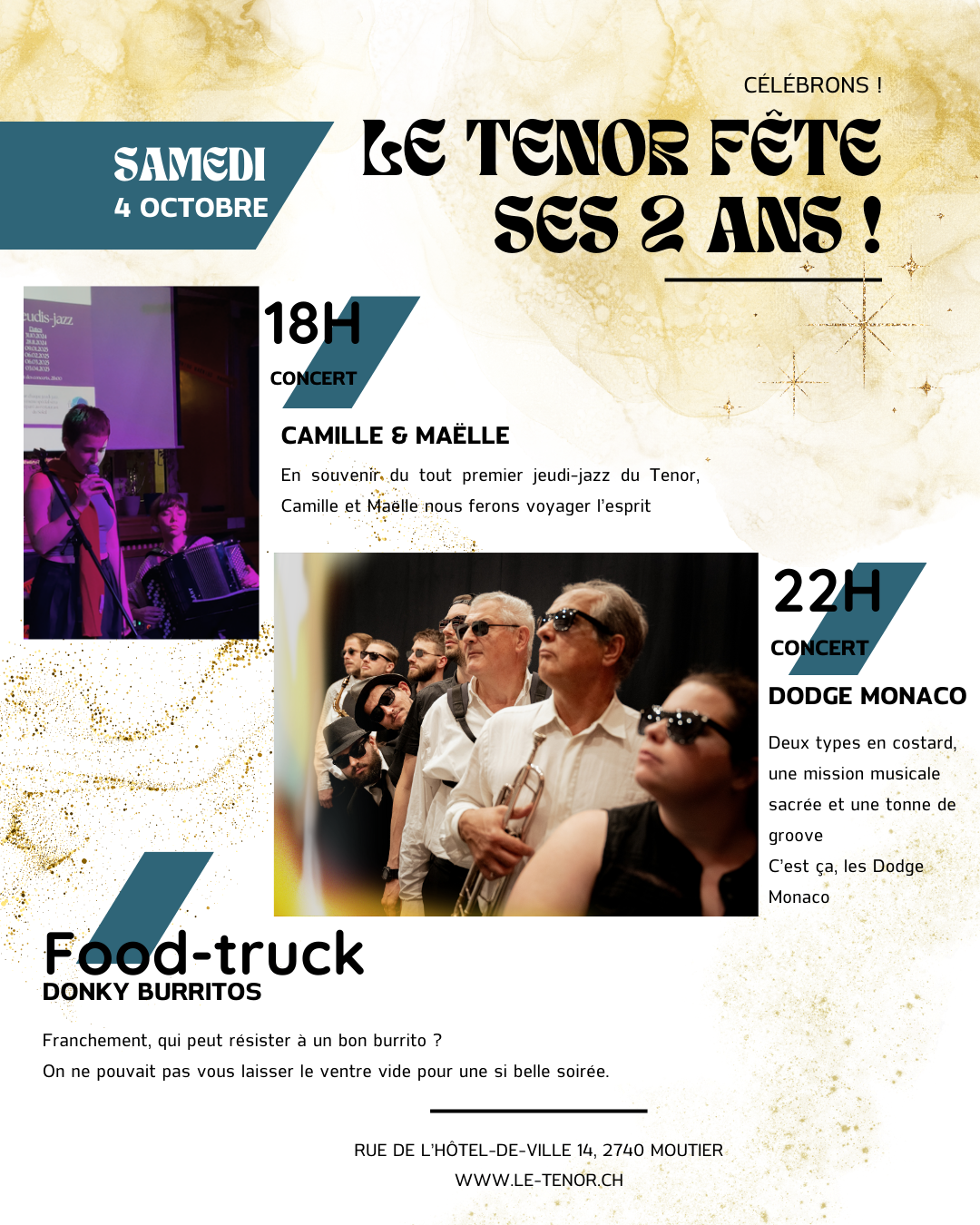 Samedi 4 octobrePour fêter comme il se doit, nous aurons le plaisir d'accueillir Camille et Maëlle pour l'apéro concert et le groupe Dodge Monaco pour la soirée !!!